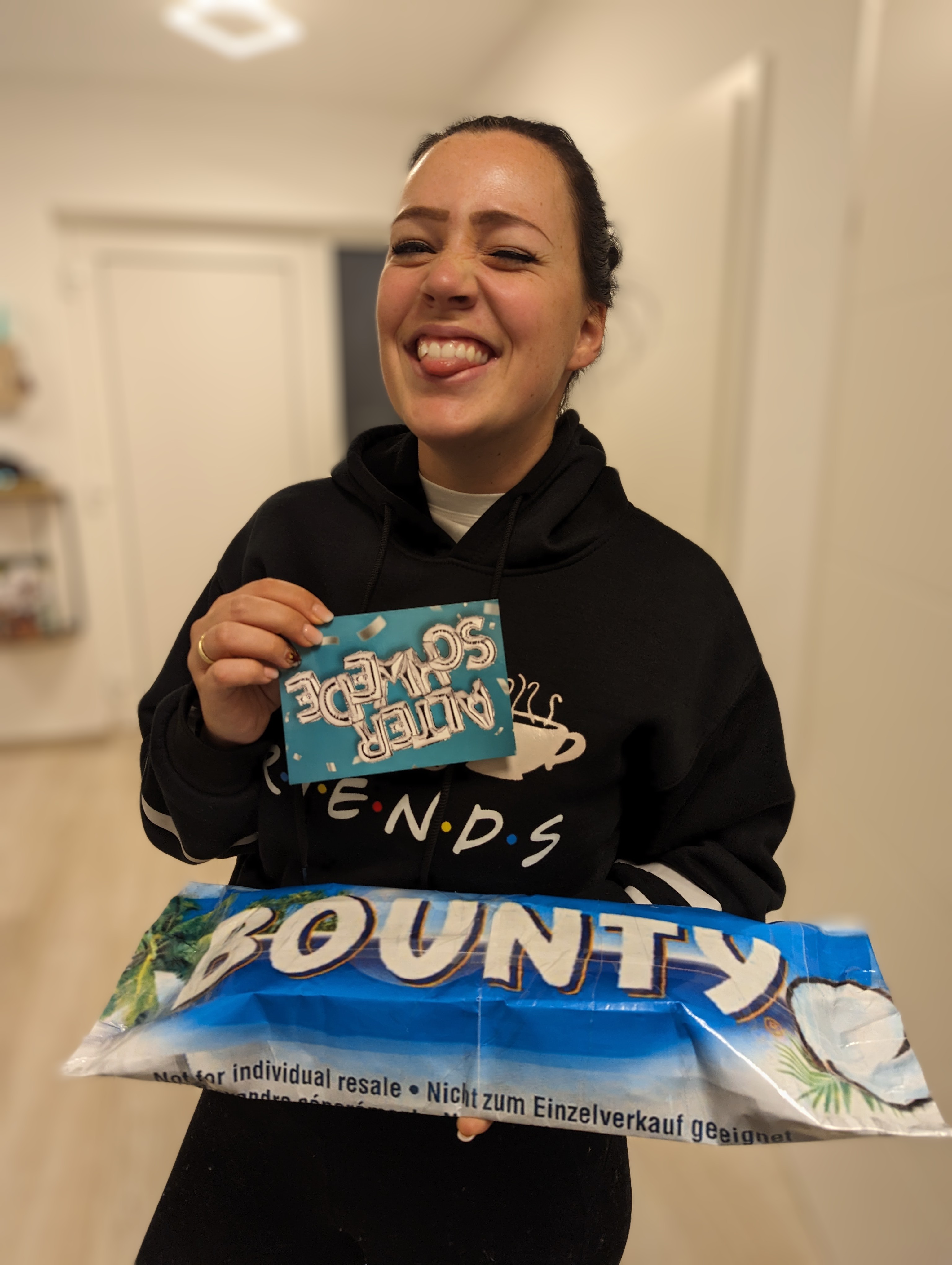 "Ich wünsche mir ein riesiges Bounty!" So hat es vor Jahren mit einem Geburstagswunsch meiner Schwägerin begonnen. Riesen-Bounty. Aja. OK, hab ich versucht und ist gelungen. Naja und was soll ich sagen - Sachen die lustig sind, mache ich dann halt öfter. Und so sind ein Raffaello, ein Maxi King, ein Country, ein Pingui und noch ein paar andere Giant-Cakes gefolgt. Alle in einem Maßstab von 1:30 (oder so), möglichst nah am Original. Sowohl was den Geschmack, als auch die Verpackung angeht. Nicht ganz einfach, nicht ganz kalorienarm, aber witzig. Und immer ein Hingucker. Auf jeder Party. Mannerschnitten sind bestellt für 2025, mussten dann aber schon ein wenig früher her. Zum Abschied in die Rente, bestellt von einem riesen Unternehmen.Danke an dieser Stelle für euer Vertrauen! Dass das Copyright für die Marke beim Hersteller bleibt, ist ja völlig klar, das will ich eh nicht haben. Aber froh bin ich, dass die kleinen Riegeln gibt - denn so kann ich große nachmachen! Sehr funny!